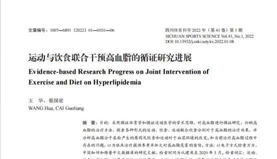 [1]王 华,蔡国梁.运动与饮食联合干预高血脂的循证研究进展,四川体育科学,2022