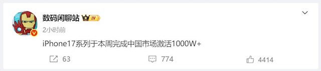 就在本周 iPhone 17系列中国市场激活量突破1000万台:卖爆了