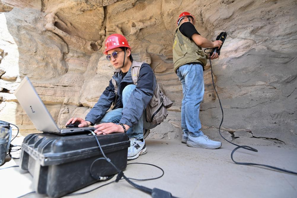 2025年4月16日,云冈研究院数字化保护中心工作人员黄绎帆(左)在云冈石窟进行数字化信息采集。新华社记者 杨晨光 摄