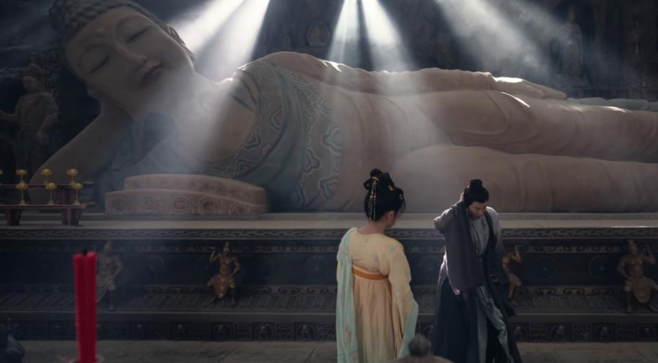 成佛寺的哭声也是他弄出来的,在鬼市买了一种能发出哭啼声的鸟,利用光线变暗就鸣叫吓人,弄得人心惶惶的。就是为了不让别人来烧香拜佛,他有时间在佛像后凿棺和偷金简。沈玉一整个疯批男鬼味,不愧是天后的私生饭!