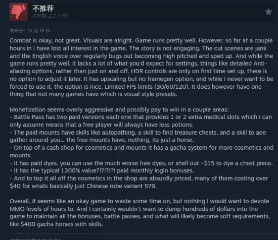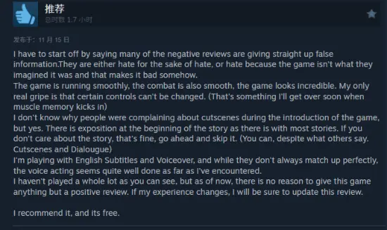 与此同时,也有玩家给出改进建议:战斗节奏略显偏慢、前期剧情信息量过大且过场无法跳过、部分英语语音出现变调加速问题,键位也无法完全自定义等。但整体来说,多数玩家认为体验依然不错,尤其画面表现十分抓眼球。
