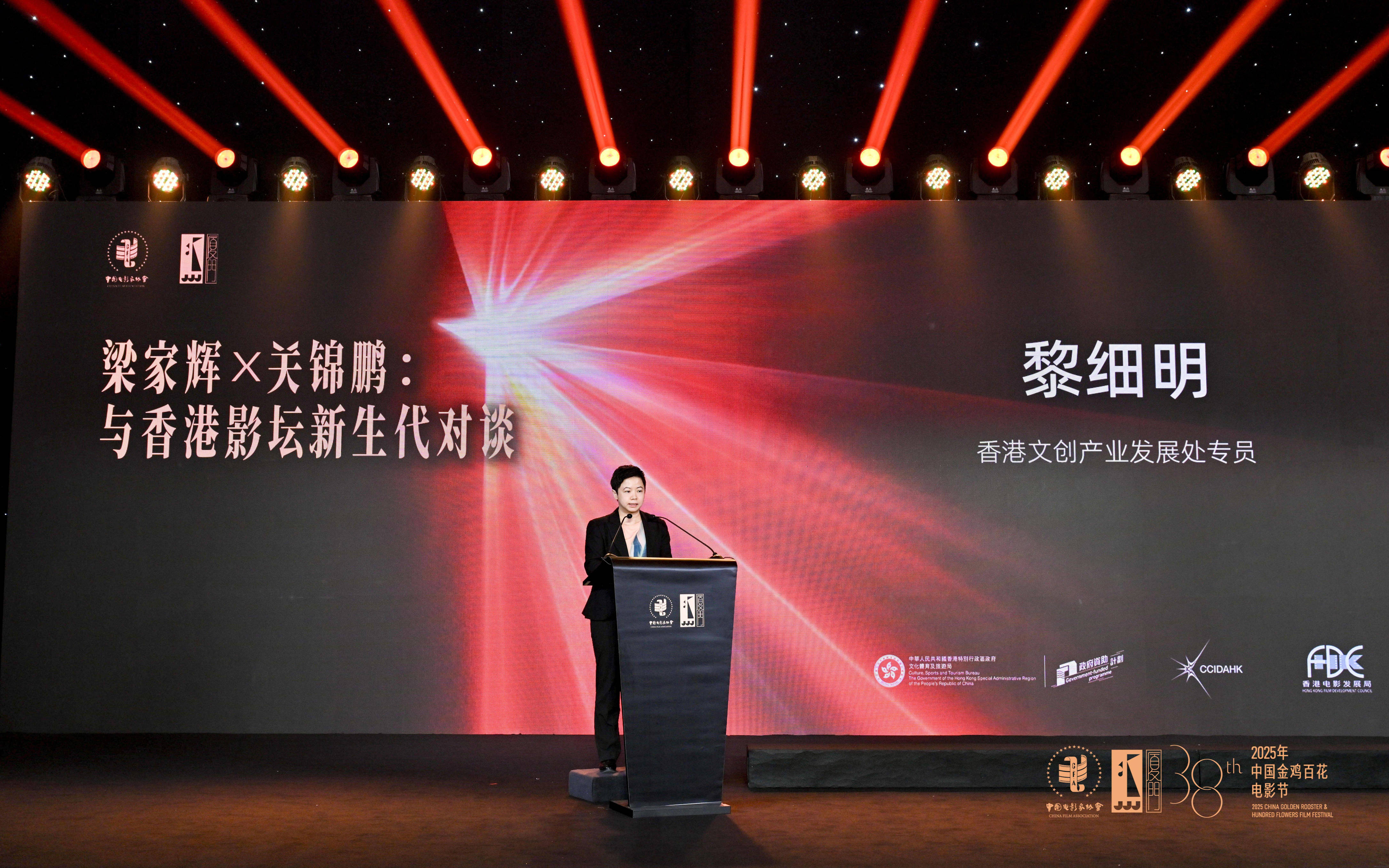 香港特别行政区政府文创产业专员黎细明在致辞中表示,香港特区政府一直高度重视并积极参与中国金鸡百花电影节,今年特别邀请梁家辉先生和关锦鹏导演展开深度对谈,并与五位青年演员进行跨代交流。她强调,希望通过这些活动让各界人士认识新一代香港电影人,推动香港与内地电影产业高质量深入发展。