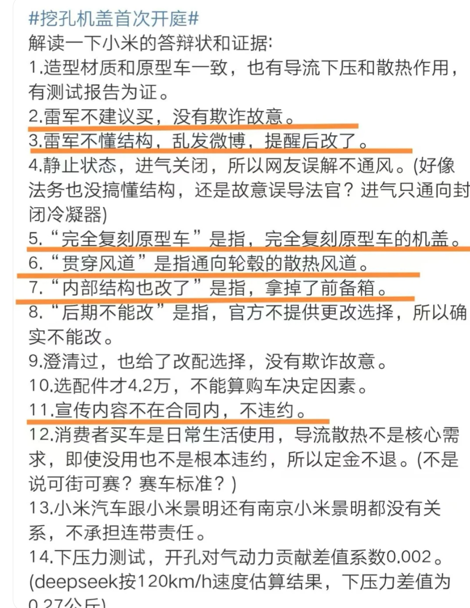 2. 雷军曾发布微博称机盖 “内部结构也改了”,后被证实仅移除前备箱,答辩中直接辩解 “雷军不懂结构,提醒后已修改”;