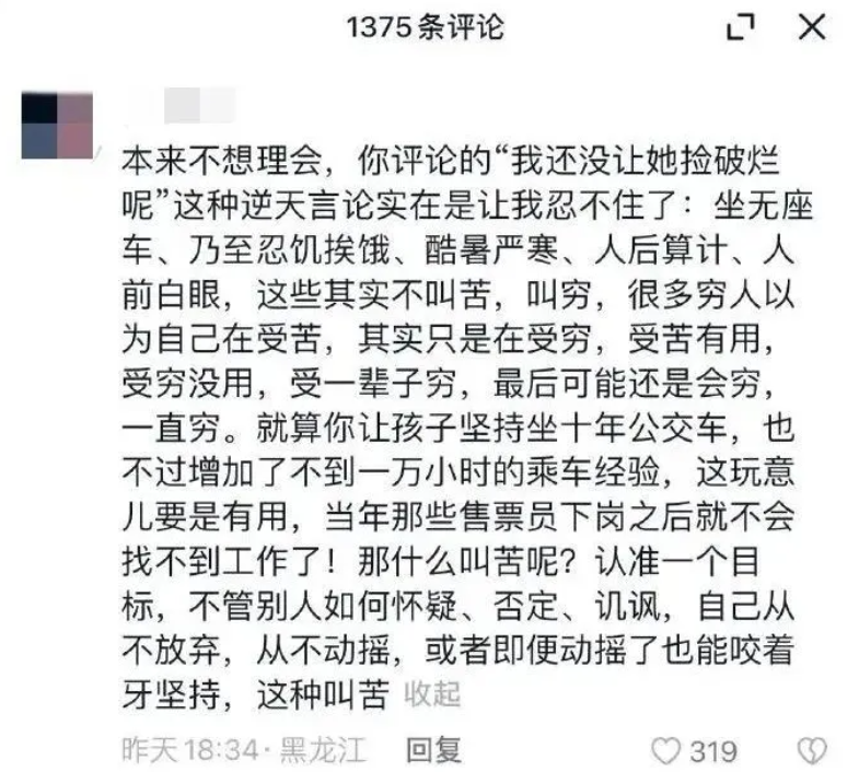 被网友质疑道,这位妈妈直接说道,“我想,我吃过的苦也让她体验一下。”并且怼道,“又没让她捡破烂”。