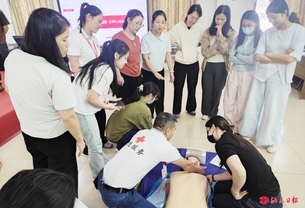 教师们在学习心肺复苏术。