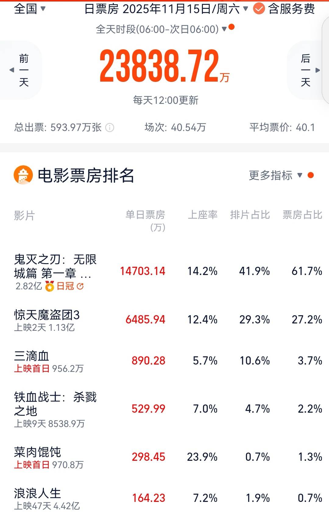 11月15日,胡歌、文淇、高子淇、闫妮、宋佳、高叶、欧豪等主演的犯罪题材剧情片《三滴血》上映,首日排片占比10.6%,收票房890万元,上座率5.7%,远不如进口片《鬼灭之刃:无限城篇 第一章》的14.2%和《惊天魔盗团3》