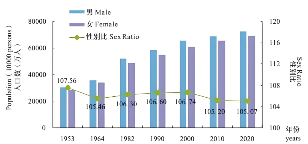 2020年“七普”时,中国的男女性别比为105.07比100,男性比女性多出3490万人。