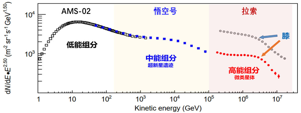 拉索测得的“膝区”宇宙线质子能谱(红点)与AMS-02测得的低能组分(黑色方块)、“悟空号”测得的中能组分(蓝色方块)一起,揭示了银河系内存在多种类的加速源,每一类有各自独特的加速能力和能量范围,而“膝”正是产生高能组分的源的加速极限表现。