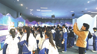 在天文体验馆,研学学生们聆听脉冲星的声音,听取天文观测发展历程、FAST建造历程讲解,观看“中国天眼”模型、形式多样的天文科普项目展示,沉浸式学习天文知识,感受国家科技的快速进步和发展。