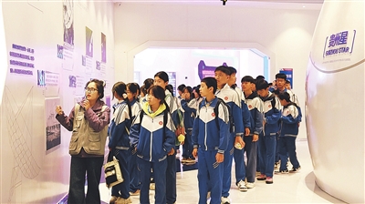 在南仁东纪念馆,研学学生聆听讲解员的介绍后,被南仁东先生爱岗敬业、敢为人先、迎难而上、无私奉献的科学精神和爱国情怀所感动。