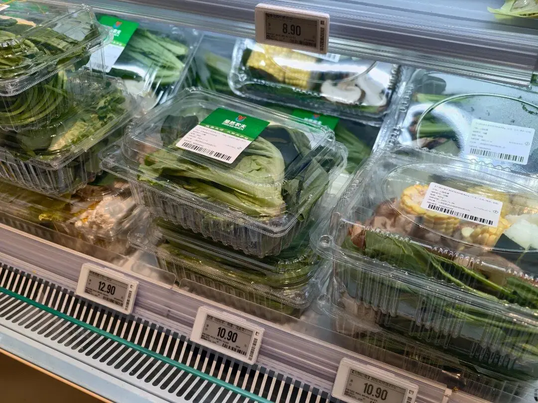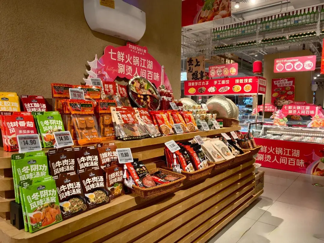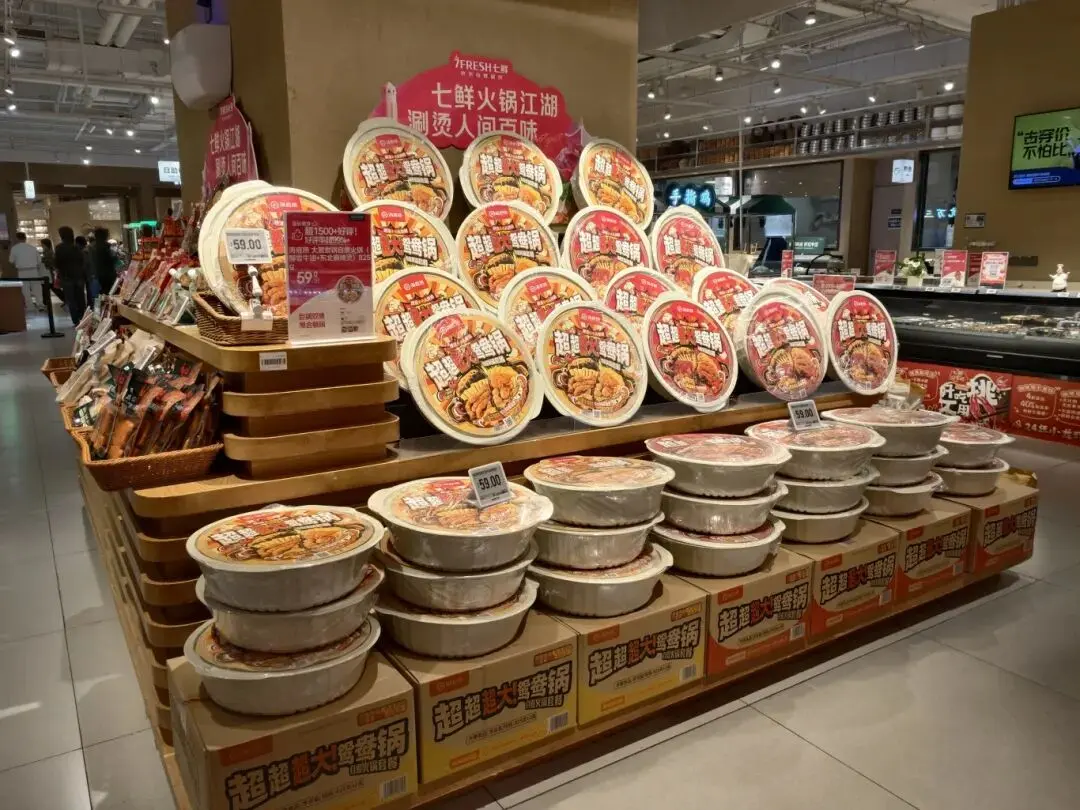 为提升便利性,超市还推出搭配好的“火锅蔬菜组合”,如叶菜三合一、菌菇拼盘等,单价10-13元。不远处的调味料区里,汤底、蘸料琳琅满目,“懒人火锅”海底捞大鸳鸯自煮火锅更是抢手,醇香牛油和东北麻辣烫两种口味,每份可供4-6人食用,满足了不愿动手的市民需求。