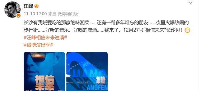 汪峰在当天发布消息的时候是这样说的,长沙有我最爱吃的那家绝味湘菜,还有一帮多年难忘的朋友,夜里火爆热闹的步行街,好听的音乐,好喝的啤酒,我来了十二月二十七号,相信未来长沙见。