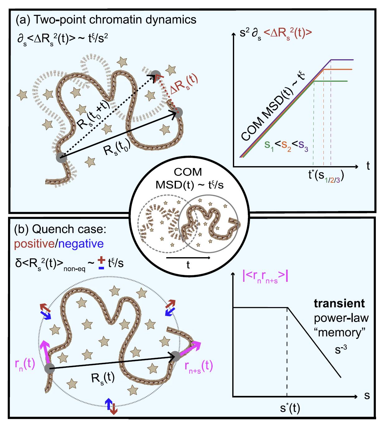 尽管有研究指出增强子与启动子之间可能存在非互惠作用,但成像数据显示的一比s规律仍与互惠力主导的动力学一致。通过解析模型和尺度关系,他们进一步推导出质心运动对两点位移的校正,并在实验数据中看到了完全对应的指数。染色质似乎确实是一条褶皱的聚合物,它的Rouse式快速运动只是早期瞬间,而更缓慢的被缠结支配的阶段会在更长的时间里显现。
