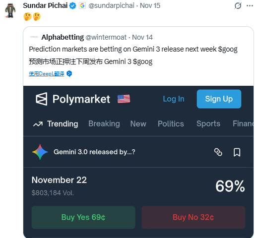 谷歌此次大模型发布前的氛围与以往明显不同。预测市场已开始押注Gemini 3.0将于下周发布,Pichai在社交平台X上用一个"思考表情"回应相关讨论,这一微妙举动被广泛解读为对发布时间的确认。