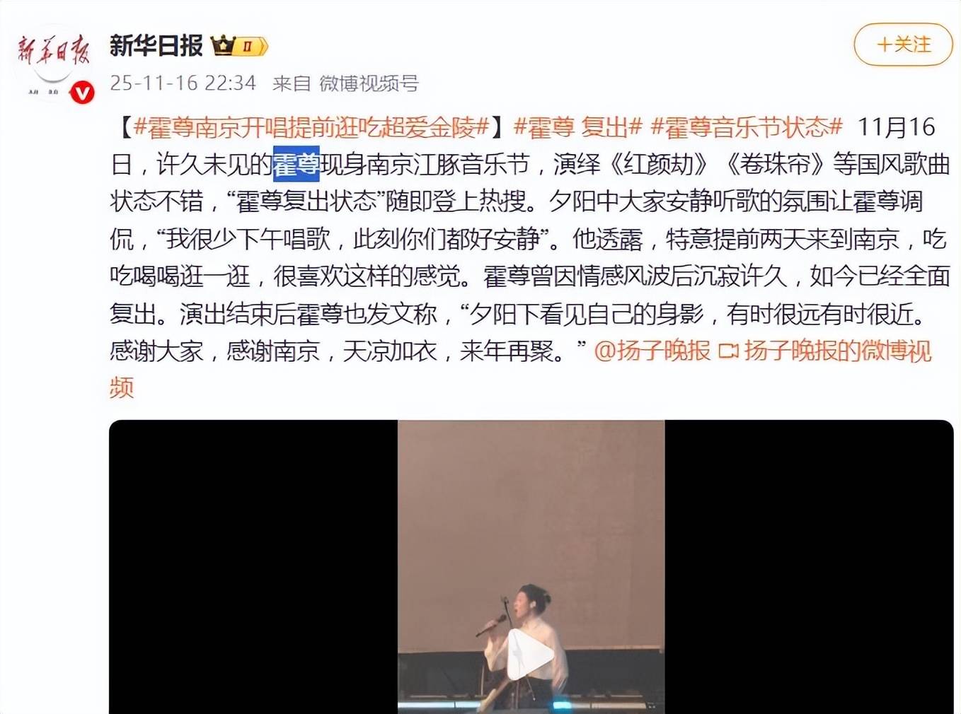 11月16日,南京江豚音乐节的夕阳余晖中,一个久违的身影登上舞台。霍尊以《红颜劫》《卷珠帘》等国风经典唤醒观众记忆,其演唱状态沉稳依旧。“霍尊复出”随即引热搜,这场演出成为他走出情感风波后全面回归的