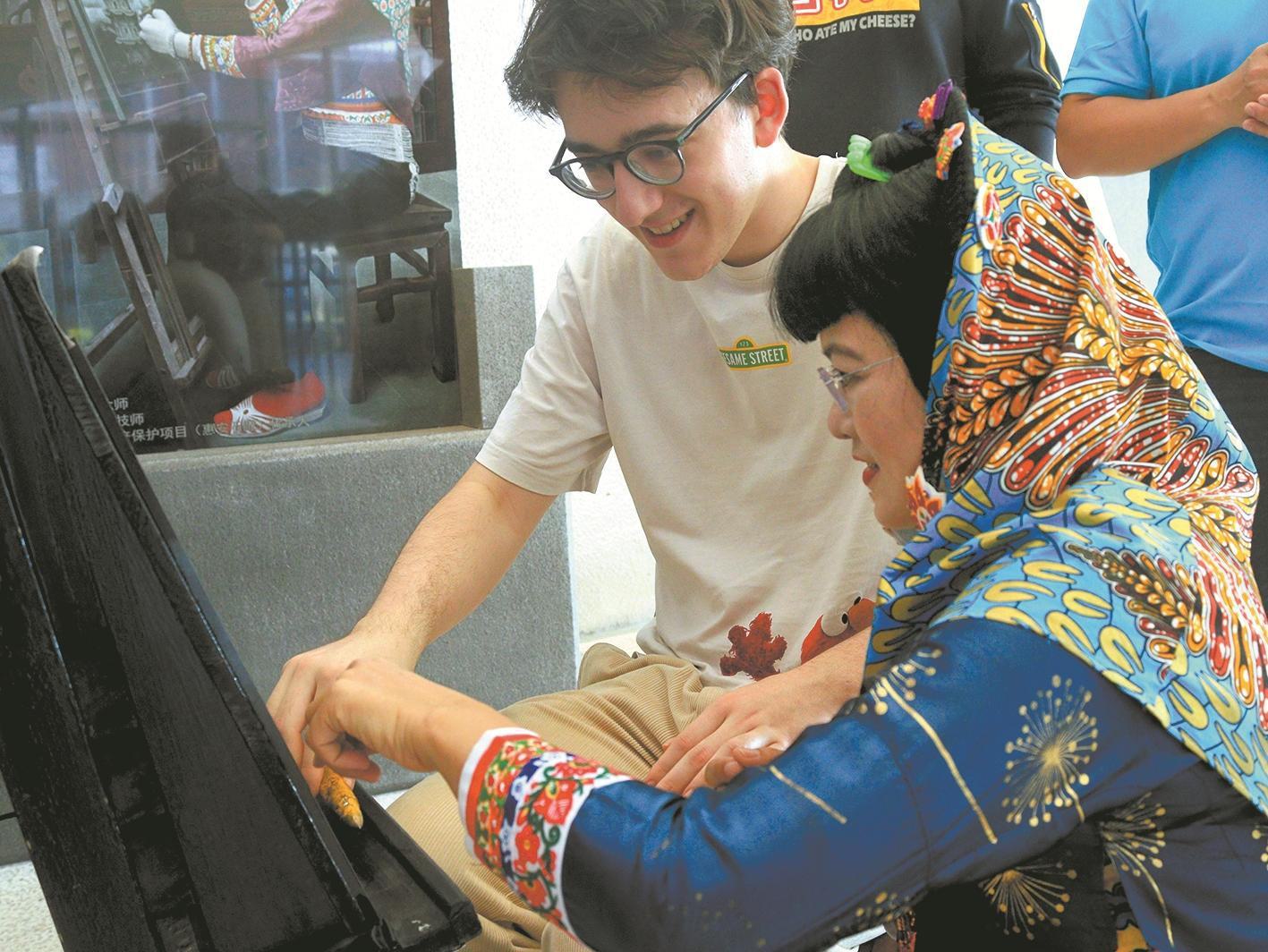 国际友人体验惠安影雕 (陈梅华 摄)