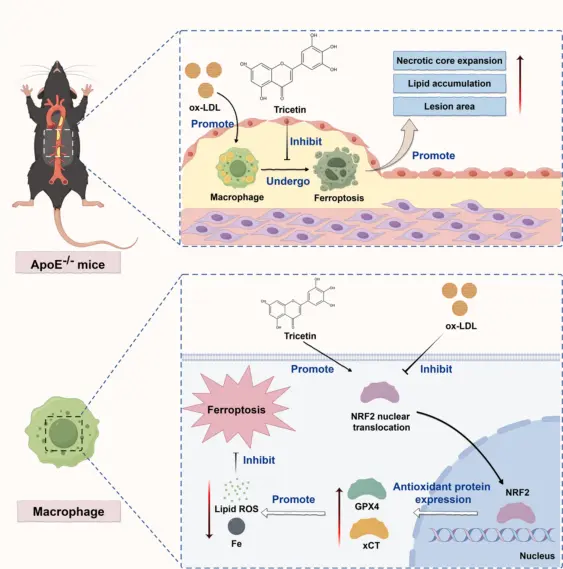 图 1. Schematic illustrating TRI attenuates atherosclerosis by inhibiting macrophage ferroptosis through activation of the NRF2 pathway[1]