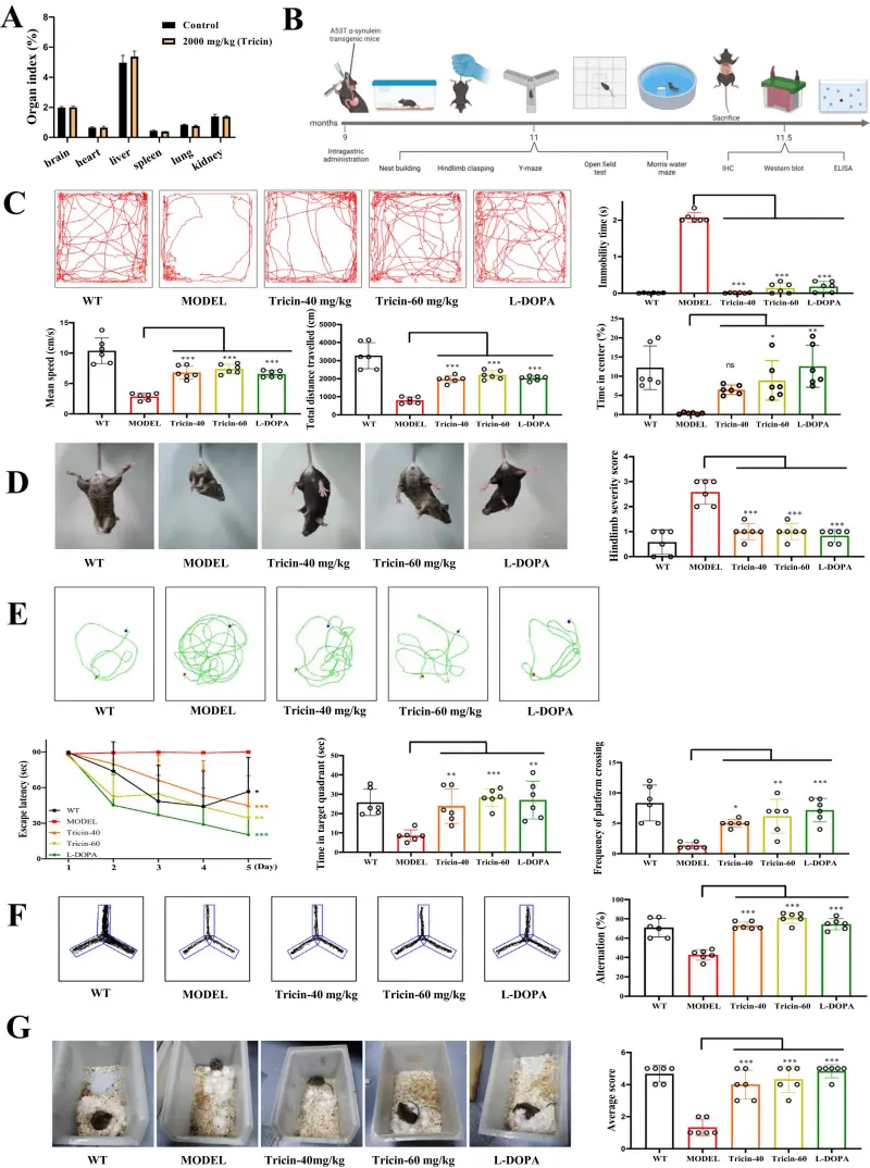 图 2. Tricin improved motor ability and ameliorated cognitive impairment in A53T-α-synuclein transgenic mice[6].