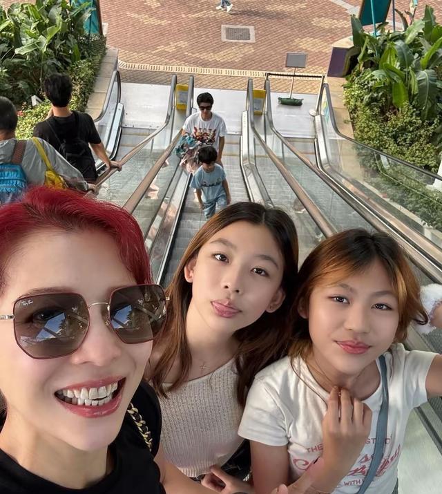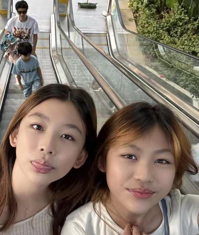 最吸睛的莫过于两个女儿,姐妹俩特意染了同款黄发,发型相近、五官酷似,站在一起就像复制粘贴的双胞胎,13岁的大女儿汤圆身高已达170cm,亭亭玉立有妈妈年轻时的神韵,11岁的小女儿包子活泼灵动,笑起来的梨涡格外讨喜。