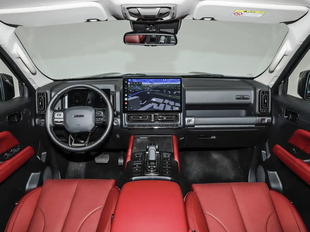 内饰的整体布局没有变,整体设计也非常硬朗,当然其内饰最大的看点肯定还是新增的熔岩红内饰配色了,像座椅、扶手箱都是红色的,同时像门板和中央岛台部分也是红色的,而中控之类的地方还是黑色的,这也提升了整个内饰的层次感。如果全是红色,看上去会很累。其它配置方面,新车配备了10.25英寸全液晶仪表+14.6英寸中控屏的组合,同时下部还有一排物理按键,这一点笔者觉得非常好。