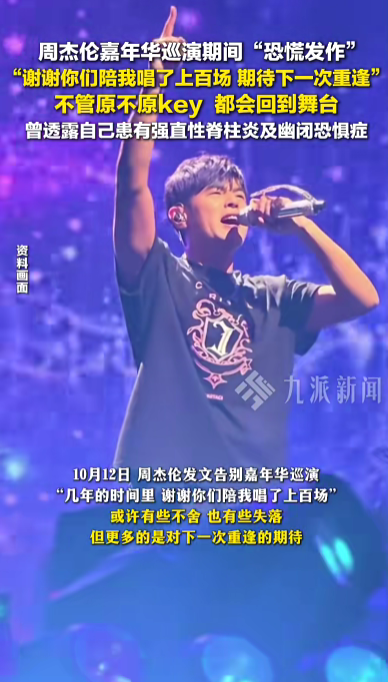 12日,周杰伦发文告别本次巡演,透露演唱会期间也会有自己无法控制的情况,比如恐慌发作无法上台等。“想到大家为了一场演唱会可能等了几年,我知道那份期待有多珍贵,正因为如此,许多取消演唱会的念头就此打住,只能好好地撑住……下一次新的巡回,我能不能每场唱原key我不知道。但我知道,不管原不原key,我还是会回到舞台跟你们继续创造回忆。”