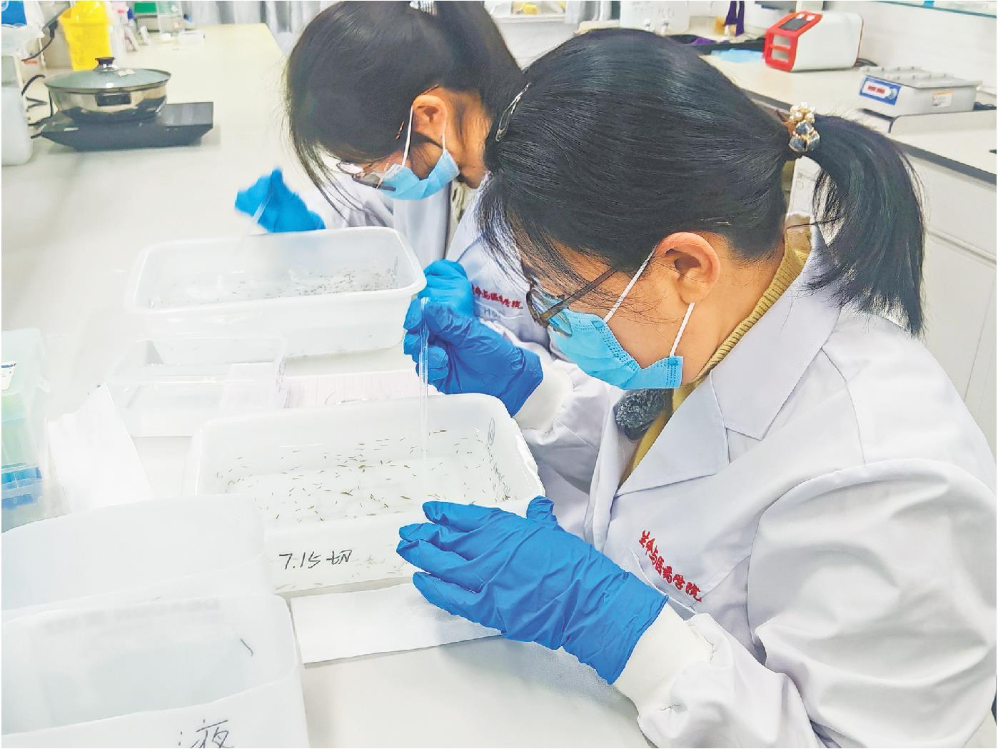 图:11月17日,在山东理工大学生命与医药学院实验室,曹忠红教授(右一)与学生在选取涡虫。(□记者 杨淑栋 报道)