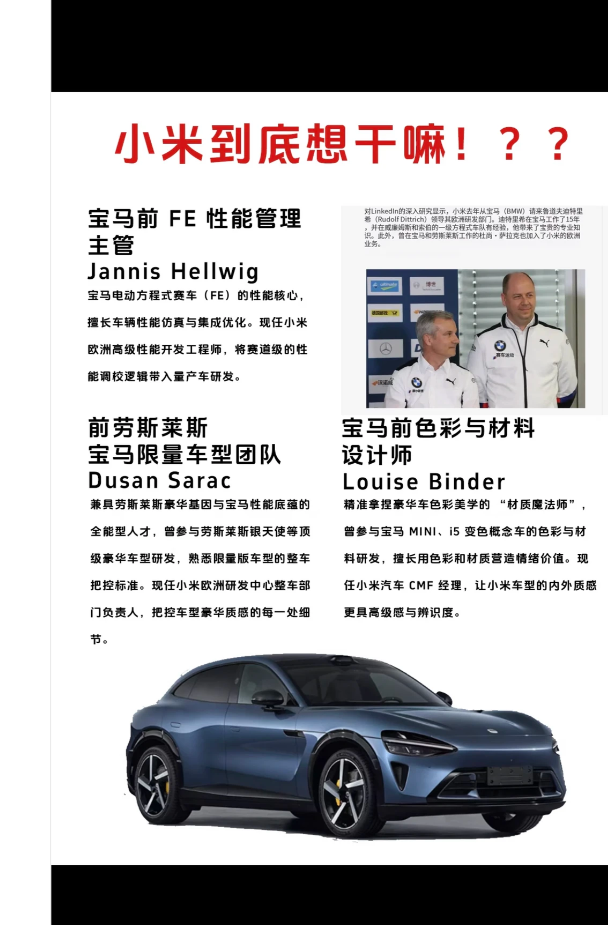 除此之外,团队还囊括宝马电动方程式赛车性能管理主管 Jannis Hellwig,将赛道级性能调校逻辑带入量产车;前劳斯莱斯宝马限量车型团队的 Dusan Sarac,用豪华车型研发经验把控整车质感;宝马前色彩与材料设计师 Louise Binder 则负责车型内外质感打造,提升产品高级感与辨识度。这些大佬覆盖汽车研发全核心环节,构成小米汽车的技术 “梦之队”。