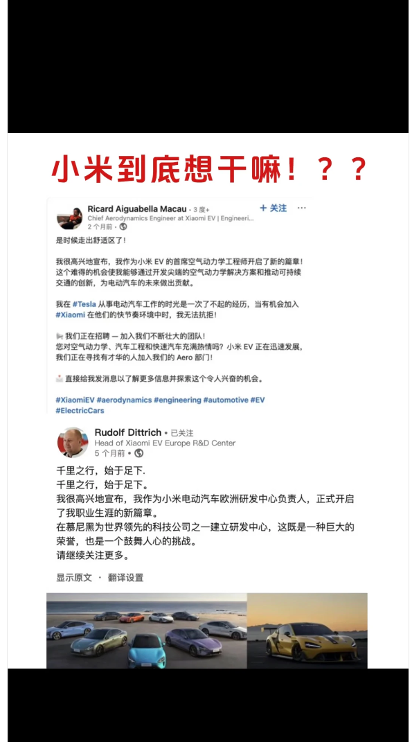 人才集结的背后,是小米汽车全球化研发网络的加速落地。Rudolf Dittrich 入职后,已正式开启在慕尼黑建立小米电动汽车欧洲研发中心的工作,这一举措被外界视为小米汽车进军欧洲高端市场的重要信号。同时,小米还在持续扩充团队,首席空气动力学工程师 Ricard Aiguabella Macau 公开招募人才,吸引全球汽车工程领域的爱好者加入,快速壮大研发力量。
