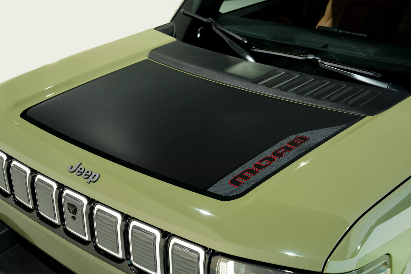 前保险杠突出设计,既能保护车头硬件,也整合了两个红色拖车钩。车尾延续 Wrangler 风格,包括 LED 尾灯、侧开式尾门和全尺寸备胎架。