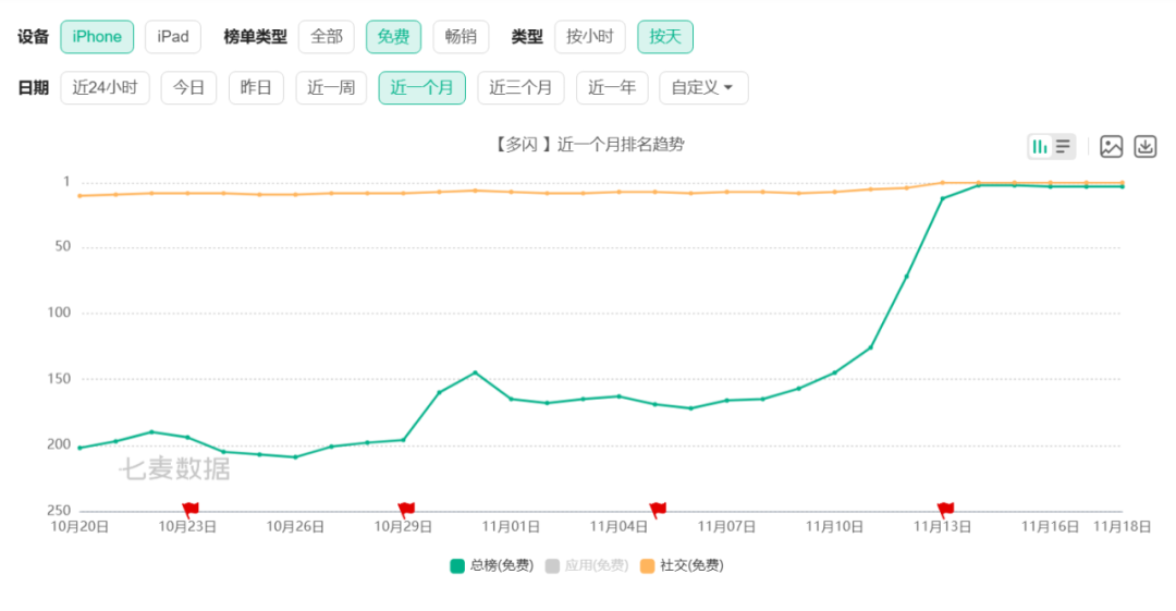 七麦数据显示,“多闪”App在App Store榜单中的变化,始于11月11日左右,从14日开始,“多闪”就在App Store社交榜单中冲到第一名,免费总榜中冲到前五名。为什么“多闪”会从几近于“消失”到App Store社交榜第一?显然,背后正是抖音发了力,抖音为什么会将“多闪”推到前台呢?