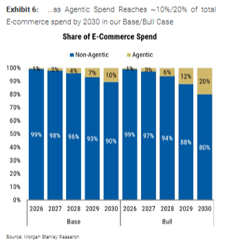 目前杂货的电商渗透率仅约12%,摩根士丹利认为AI代理的多步骤、多模态购物能力(如通过照片分析冰箱存货,自动生成购物清单)将成为提升渗透率的重要推动力。杂货之后,家居用品、个人护理和服装是下一批受益品类。