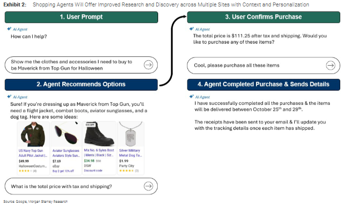 摩根士丹利研究团队认为,从2025年到2027年,科技巨头们预计将在数据中心投入累计约1.7万亿美元资本开支。这些投资正在催生新一代生成式AI产品,而AI购物代理被视为下一个重大突破点。这个“永远在线”的“网购Agent”能够: