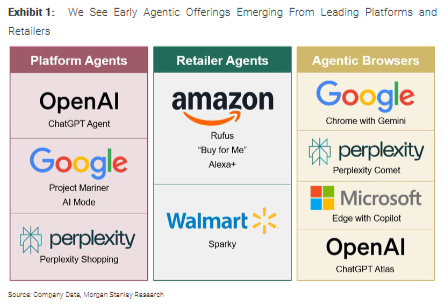研报认为,当消费者通过第三方Agent(如OpenAI的ChatGPT)完成购物时,零售商不仅失去了直接触达客户的机会,还可能需要向Agent支付佣金,这对其利润表是双重打击。
