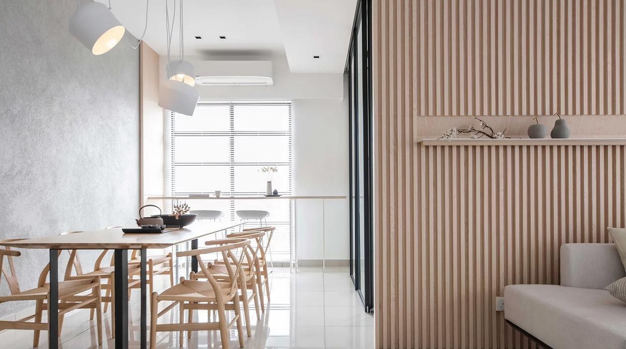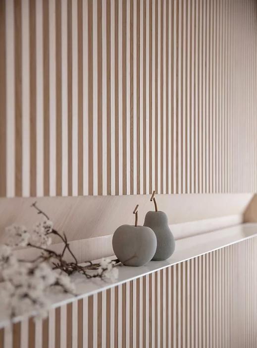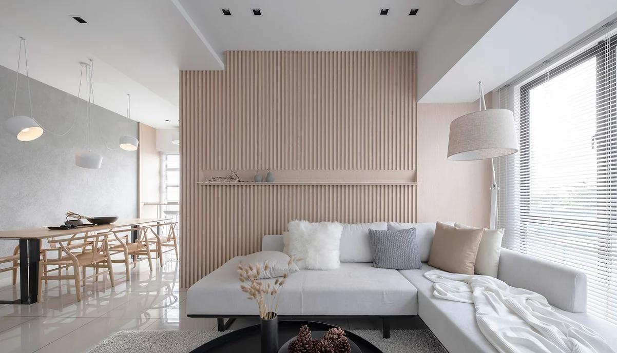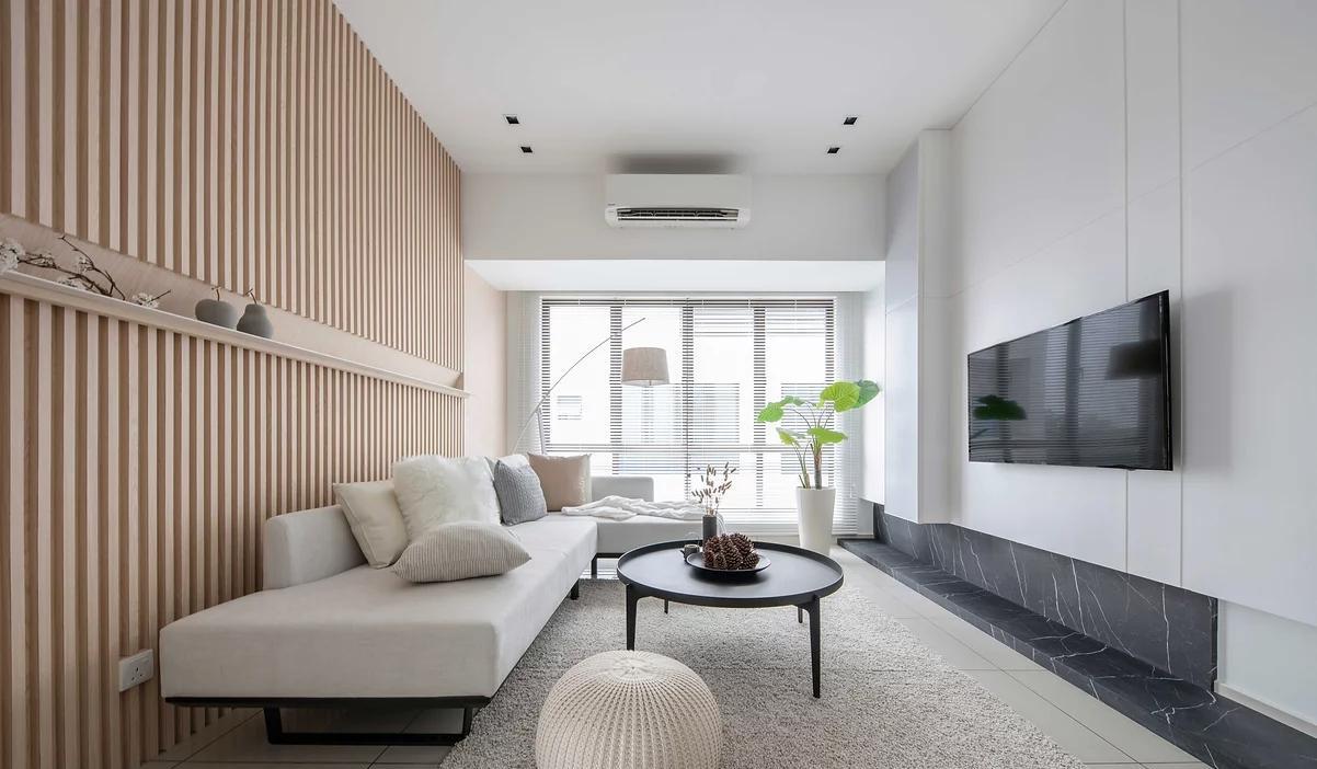 整面木格栅做沙发背景墙,中间做平台,摆放一些装饰品,让背景墙不那么单调,沙发处铺上地毯,光脚踏足也感到不会冰冷,增加舒适感。