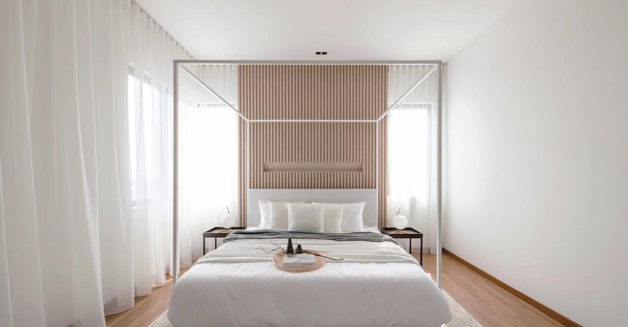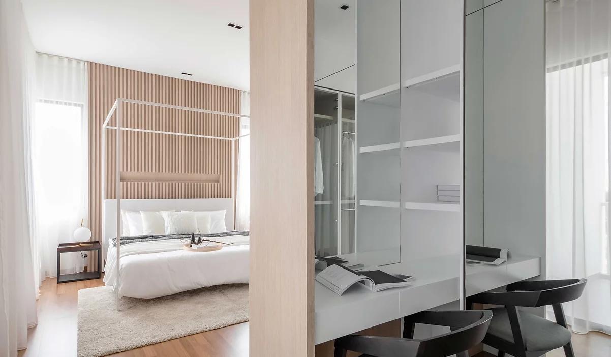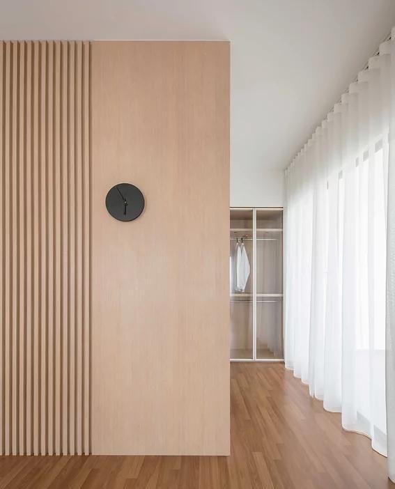 主卧床头背景沿用木格栅,减少大白墙带来的单调,两边摆放边几,满足简单置物,床尾设步入式衣帽间,一面做梳妆台,侧边搭配做开放式格架,方便瓶瓶罐罐的摆放。