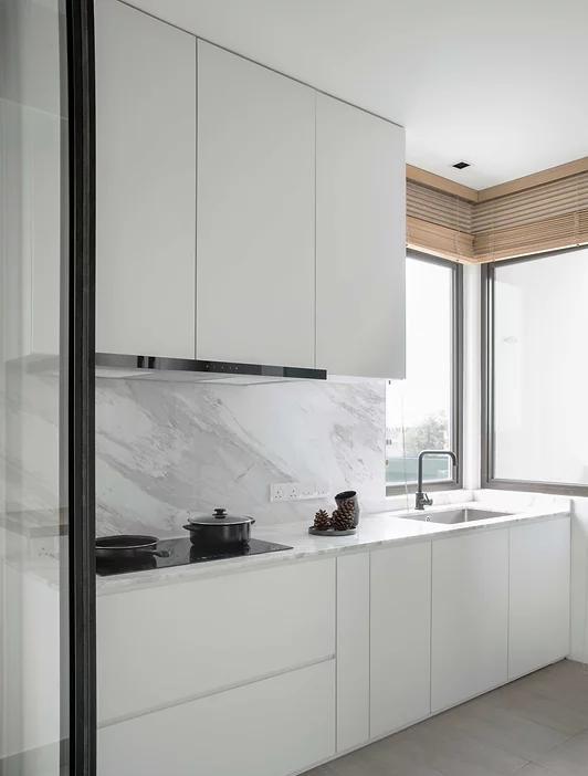 厨房安装玻璃门,橱柜和台面统一选择白色,同时搭配无把手柜门,看上去格外清爽,灶台前面墙铺贴同台面一样的石材,视觉上更统一,转角处的两扇窗户让厨房采光更好。