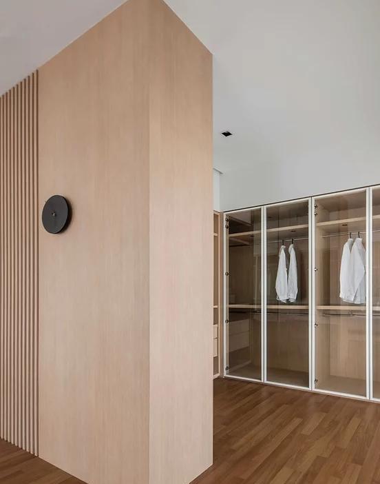 衣柜加装玻璃柜门,通透性更好,但也要考虑安全性,且非常考验屋主的自律程度,一旦没收拾好,就显得十分凌乱,所以也要做好内部的分层收纳。