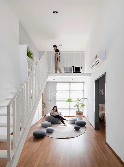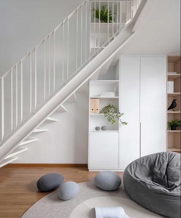家里还预留一块地方做休闲,层高足够就搭个小二层,楼梯下方增加储物柜,配上懒人沙发、地毯,闲来无事晒着太阳,看看书,快乐就是这么简单。