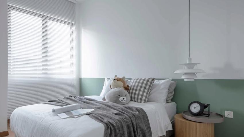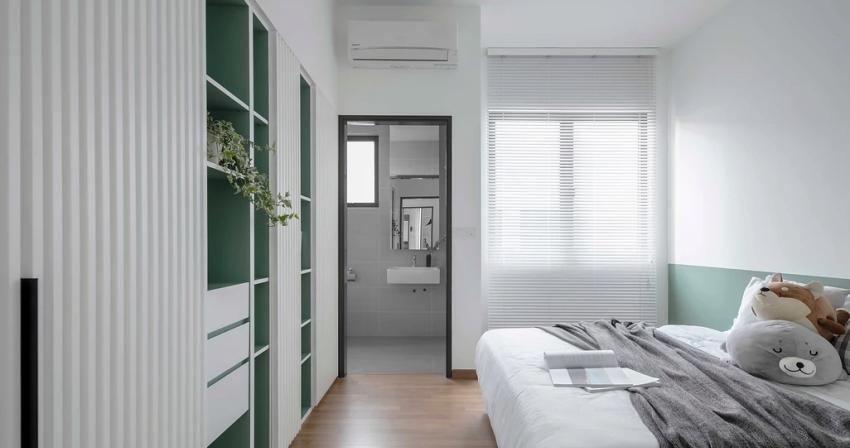 男孩卧室更注重颜色的搭配,床尾设一整面衣柜,且与墙面颜色相呼应,局部开放式,方便存放孩子的阅读绘本等,整体有藏有露。