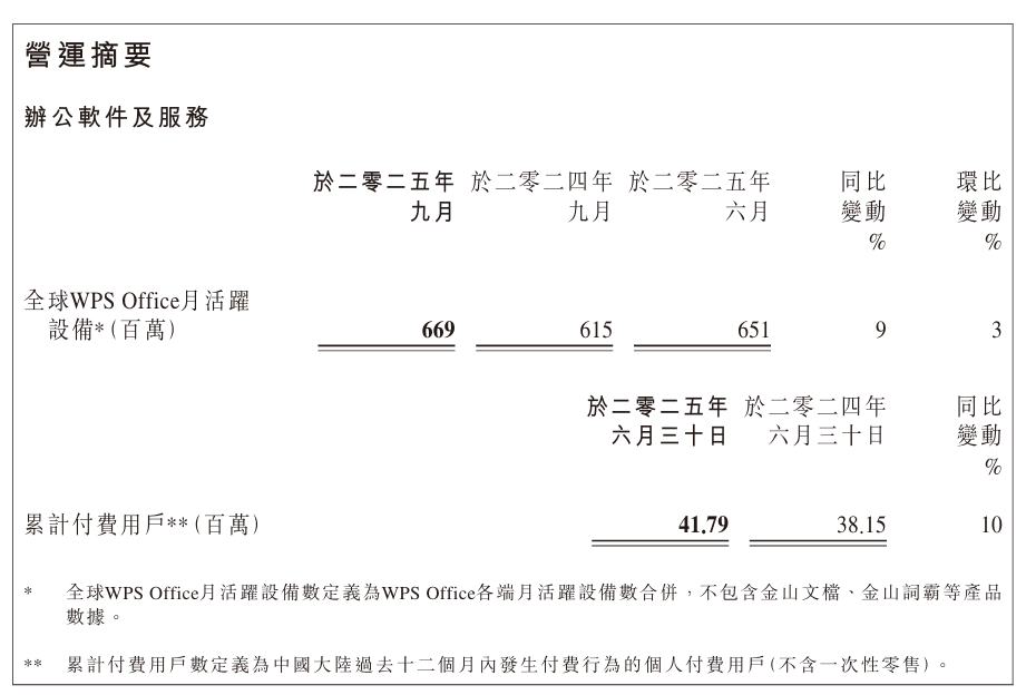 截至 2025 年 9 月,全球 WPS Office 月活跃设备达 6.69 亿,同比增长 9%,环比增长 3%;截至 2025 年 6 月底,办公软件及服务累计付费用户 4179 万,同比增长 10%。