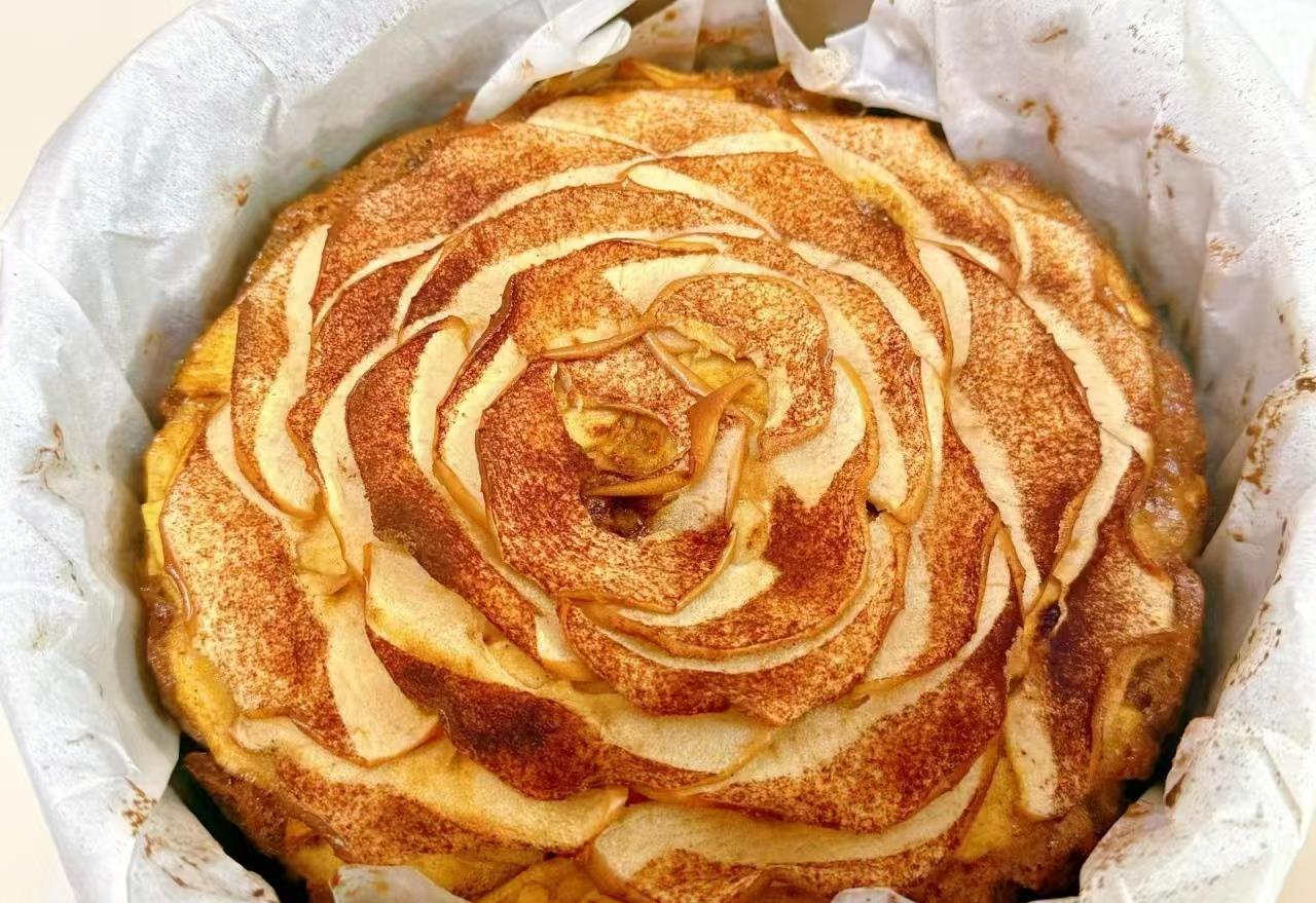 3、表面装饰苹果片撒上一层可可粉(或肉桂粉),烤箱180度预热,烘烤50分钟。出炉冷却后再吃口感会好点。