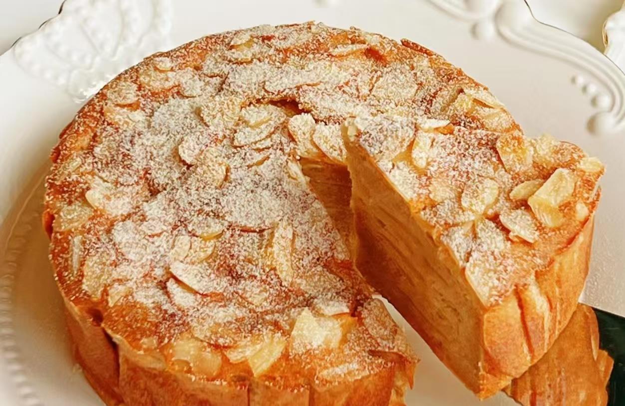 3、6寸蛋糕模具中铺好油纸,将苹果片依次叠加放入模具中,再倒入剩余的面糊,表面撒上杏仁片。