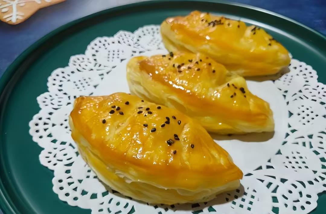 5、最后在挞皮的表面刷上一层蛋黄液。撒上少许黑芝麻,烤箱提前预热190度10分钟。将烤盘放入预热好的烤箱,中层190度20-25分钟。