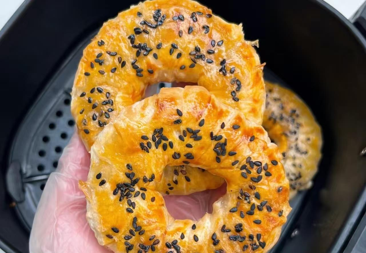 4、烤箱预热到180度。把准备好的苹果甜甜圈放在烤盘上,放进烤箱中层。烤20分钟左右,中间记得翻一次面,两面烤得金黄酥脆即可。