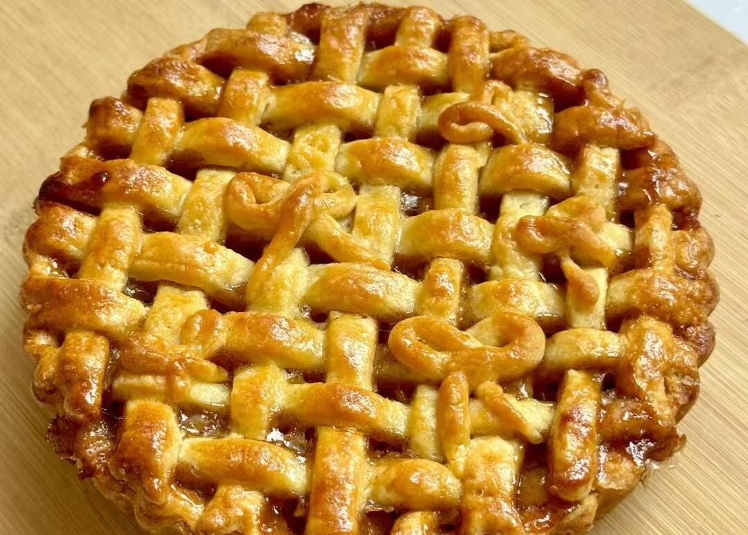 6、在模具派皮上,放入苹果馅,在将切好的长条按照大小排列,编制出网格铺在上面。刷上蛋液,放入烤箱 200度 15分钟,再170度 20分钟 就好啦。