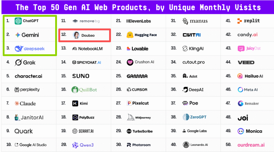 最近,美国顶级风投机构发布了《AI应用百大榜单》,前三分别是ChatGPT、Gemini、DeepSeek,豆包仅仅排在了第12。