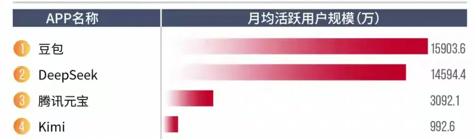 该数据更指出,“DeepSeek流失用户里,有近4成去了豆包”,豆包App成为国内移动端用户量最大的AI聊天助手。