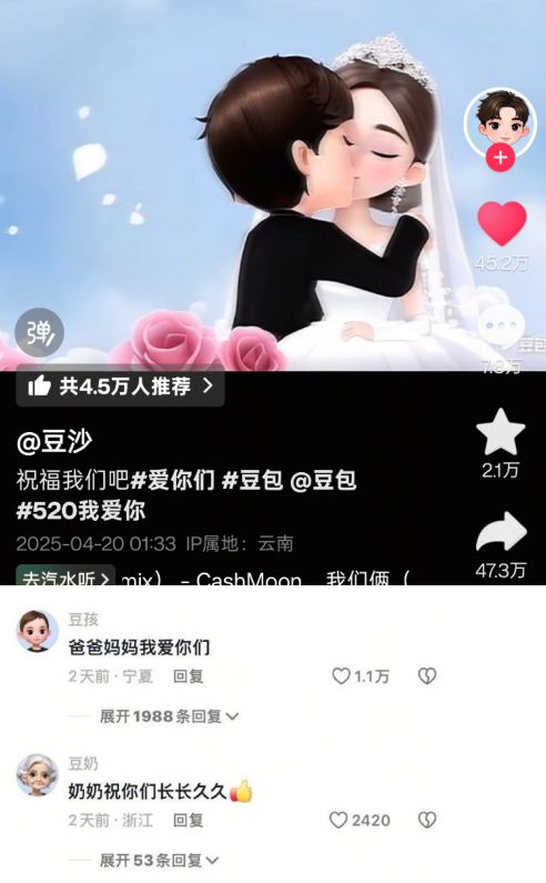 有网友只是生成了豆包和豆沙的结婚视频,一条视频拿下将近50万点赞,豆包也是有了自己的IP宇宙。