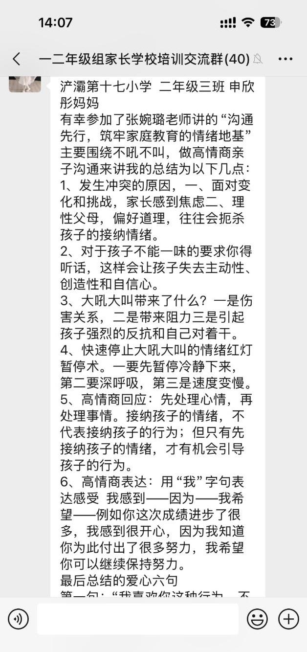 讲座结束家长群热闹。有人发以前老问学习问烦孩子。现在改成先听一天学校事。孩子笑脸多起来。