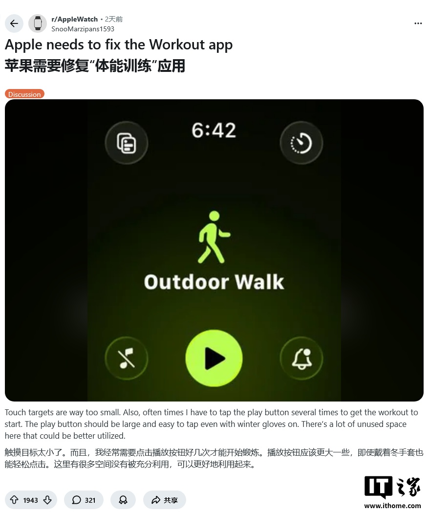 部分用户不满苹果 watchOS 26 健身应用:按钮太小、加载延迟等